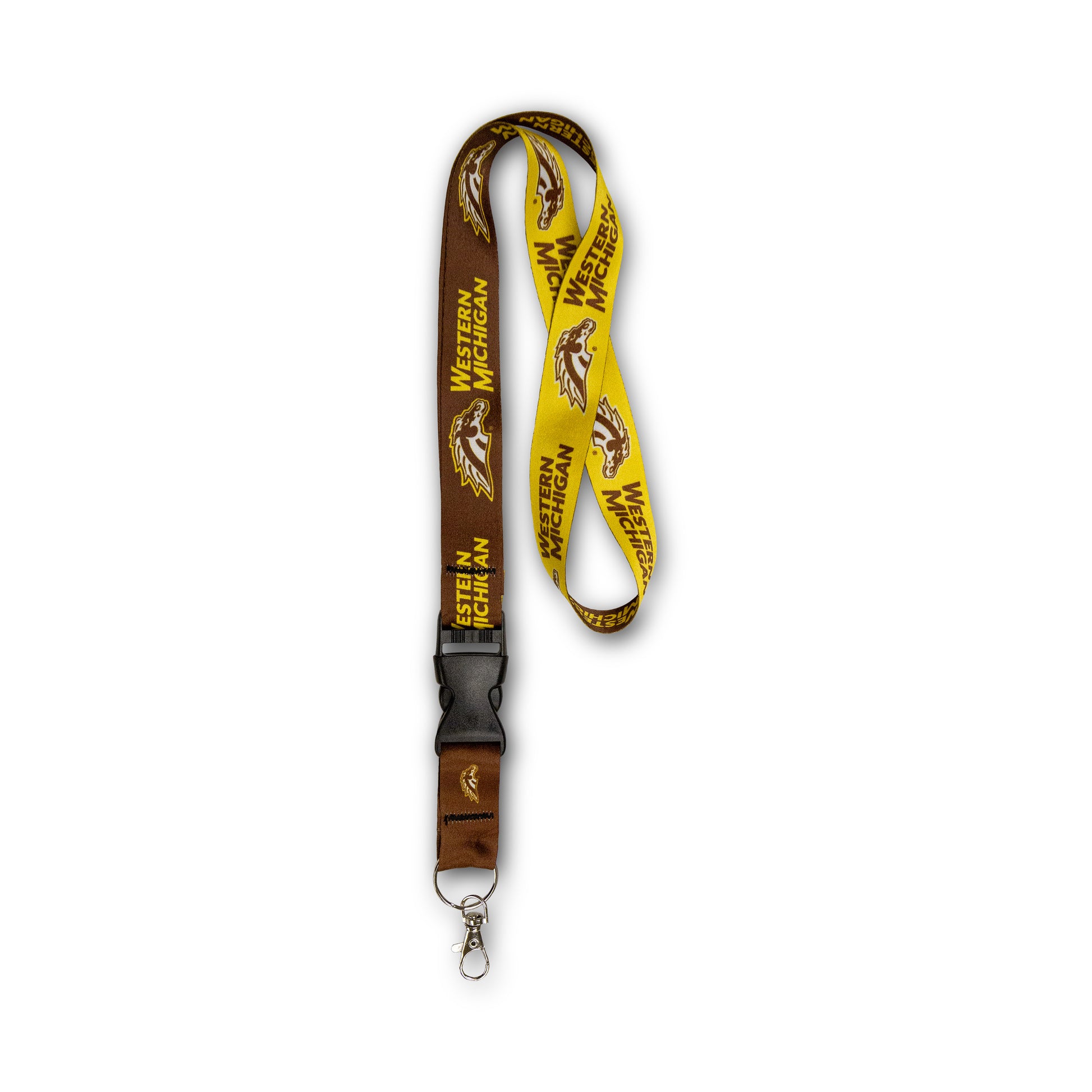 Woven lanyard features the school name in a repeating pattern along the strap. Lanyard has a plastic buckle with an attached metal clip that is handy for keeping hands free while having ID, keys, or even a whistle available at your fingertips.